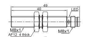 LR08BF15DPO-E1, czujnik indukcyjny, zbliżeniowy, zasięg 1,5mm, PNP, NO, 2kHz, konektor M8, czoło schowane, 10-30V DC, stal nierdzewna
