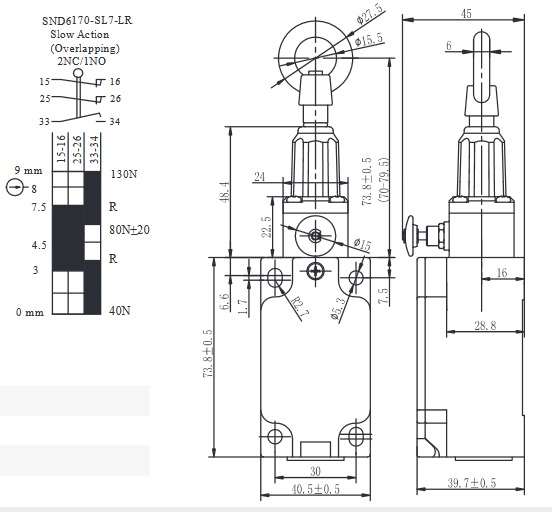 Standardowa konfiguracja styków: | SL7: 1NO+2NC – (Slow Action) |