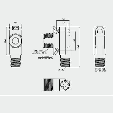 | 95B040150 | US18-PL-5-N03-PH = Ultrasonic square right angle mounting – PNP – M12 |